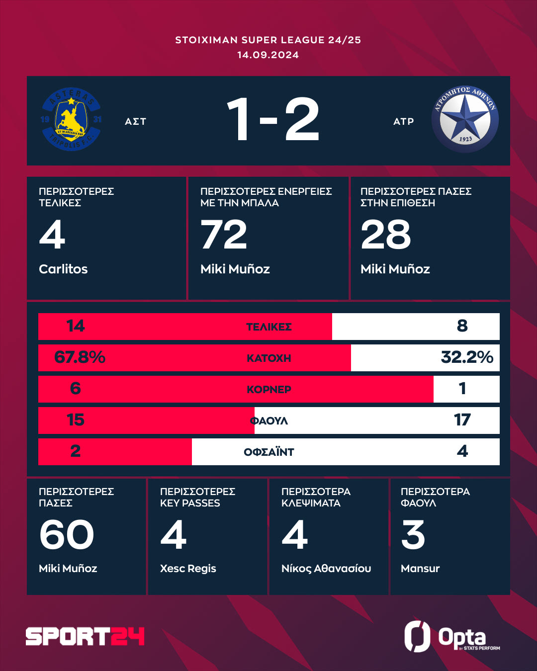 Ο Ατρόμητος πέρασε από την Τρίπολη επικρατώντας 2-1 του Αστέρα AKTOR έχοντας ως κορυφαίο τον Καρλίτος που είχε γκολ και ασίστ. Ο Μπαρτόλο με πέναλτι διαμόρφωσε το τελικό σκορ, με τον Κλοντ Μακελελέ να βλέπει το ματς από τις εξέδρες.