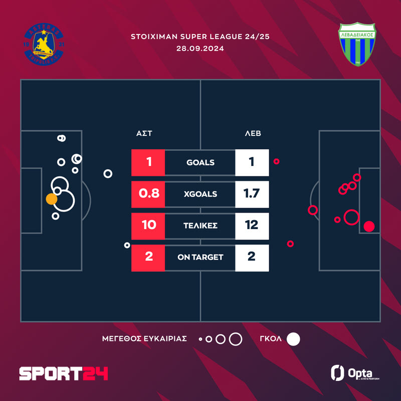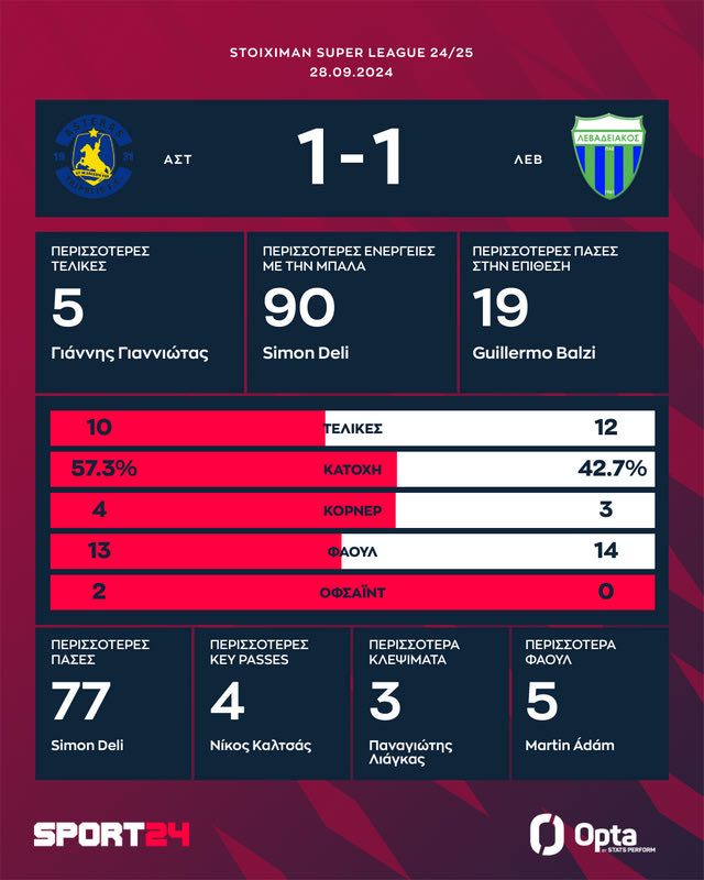 Παρά τις καλές στιγμές που δημιούργησαν, Αστέρας και Λεβαδειακός δεν κατάφεραν να βρουν κάποια καλή τελική και έτσι έμειναν στο 1-1 παίρνοντας από έναν βαθμό.