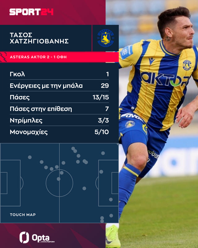 Ο Τάσος Χατζηγιοβάνης πέτυχε ένα απίθανο γκολ ισοφαρίζοντας για τον Αστέρα AKTOR απέναντι στον ΟΦΗ και αμέσως έσπευσε στον πάγκο της ομάδας αγκαλιάζοντας τον Σάββα Παντελίδη μην μπορώντας να συγκρατήσει τα δάκρυά του.
