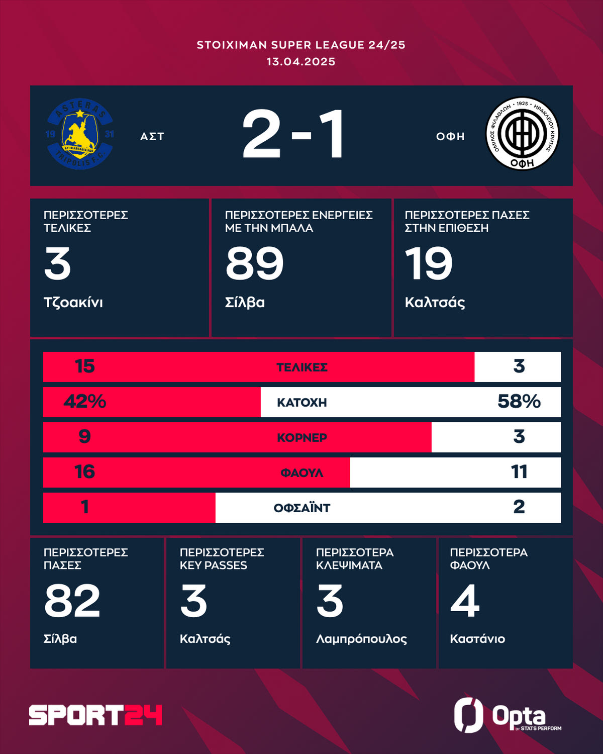 Αστέρας Τρίπολης AKTOR – ΟΦΗ 2-1: Οι Αρκάδες πήραν την άτυπη ρεβάνς και διατήρησαν ζωντανές τις ελπίδες για την 5η θέση