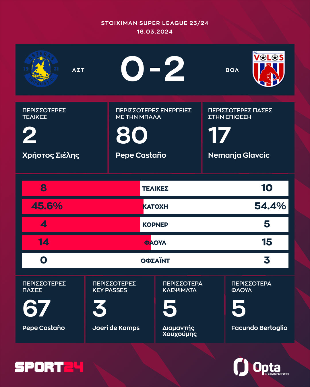 Ο Βόλος ακολούθως πέτυχε δύο γκολ σε επτά λεπτά με τους Κόμπα και Γκαρσία και πήρε ένα τεράστιο διπλό στη μάχη που δίνει για την παραμονή. Ο Αστέρας δεν είχε πολλές τελικές για να σκοράρει, παρά μόνο ένα ωραίο τακουνάκι του Καστάνιο στις καθυστερήσεις που κατέληξε στην εξωτερική πλευρά των διχτυών.