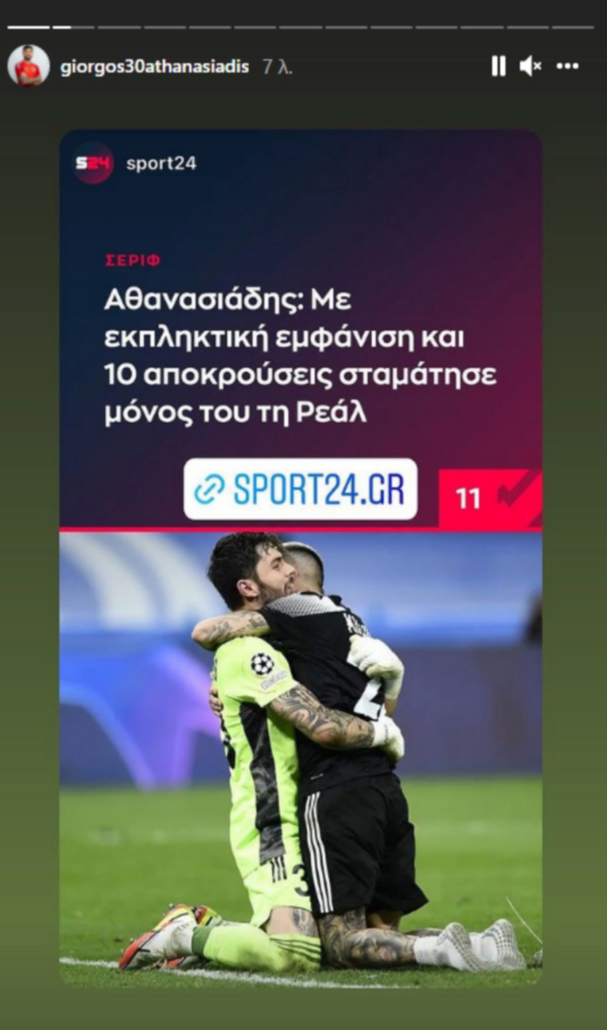Δεν παρέλειψε όμως να κάνει μια γύρα στα media και να δει τι έγραφαν για όσα έκανε η ομάδα του και φυσικά ο ίδιος στη διάρκεια του 90′. Μάλιστα έκανε repost στον λογαριασμό του στο instagram το θέμα του SPORT24 που αναφερόταν στην εκπληκτική του εμφάνιση με τις 10 επεμβάσεις με τις οποίες σταμάτησε μόνος του την ομάδα της Μαδρίτης.