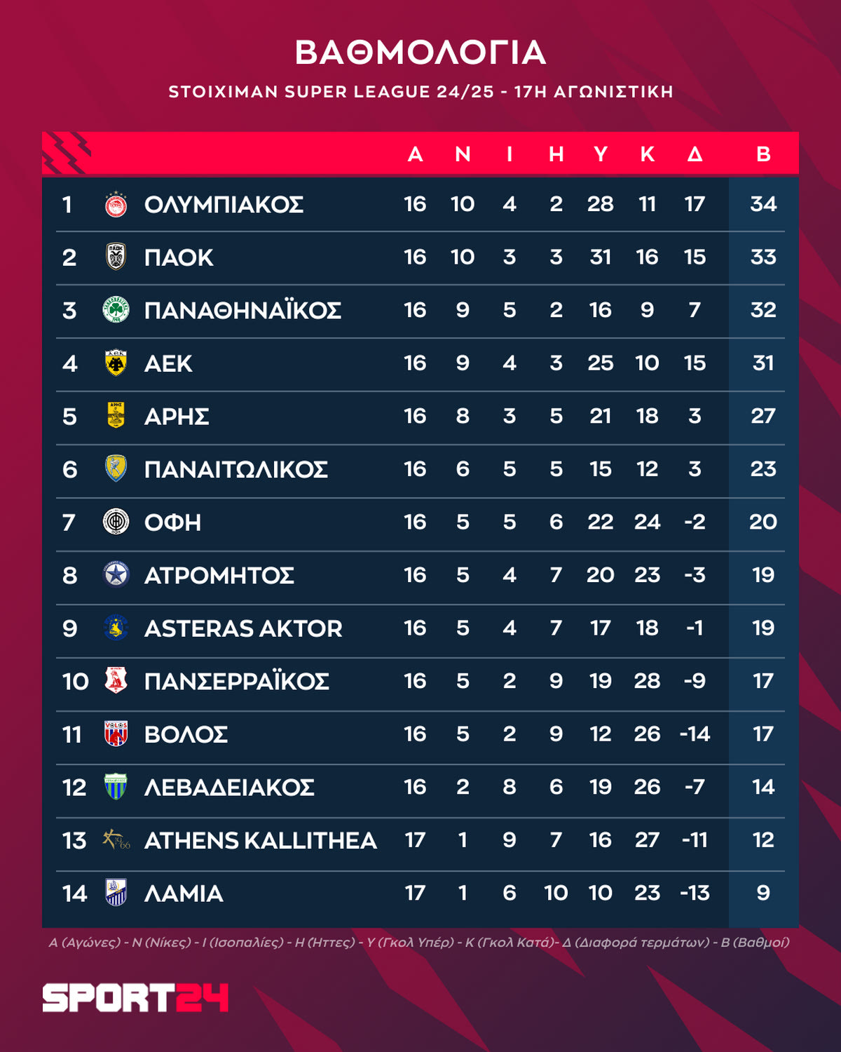 Η βαθμολογία της Stoiximan Super League μετά το Athens Kallithea - Λαμία