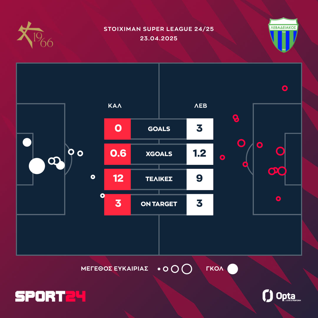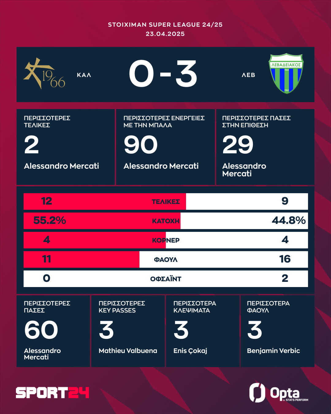 Ο Λεβαδειακός συνεχίζει την εξαιρετική του σεζόν, καθώς πέρασε από τη Λεωφόρο επικρατώντας 3-0 της Athens Kallithea στο πλαίσιο της τέταρτης αγωνιστικής των playouts της Stoiximan Super League. Τα χρυσά γκολ για την ομάδα του Νίκου Παπαδόπουλου πέτυχαν οι Τσάπρας, Μπάλτσι και Όζμπολτ.