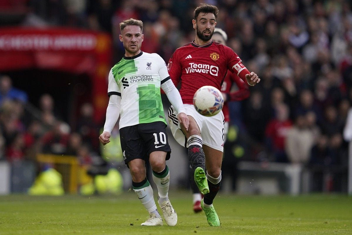 Liverpool's Alexis Mac Allister, left, is challenged by Manchester United's Bruno Fernandes during the FA Cup quarterfinal soccer match between Manchester United and Liverpool at the Old Trafford stadium in Manchester, England, Sunday, March 17, 2024. (AP Photo/Dave Thompson)