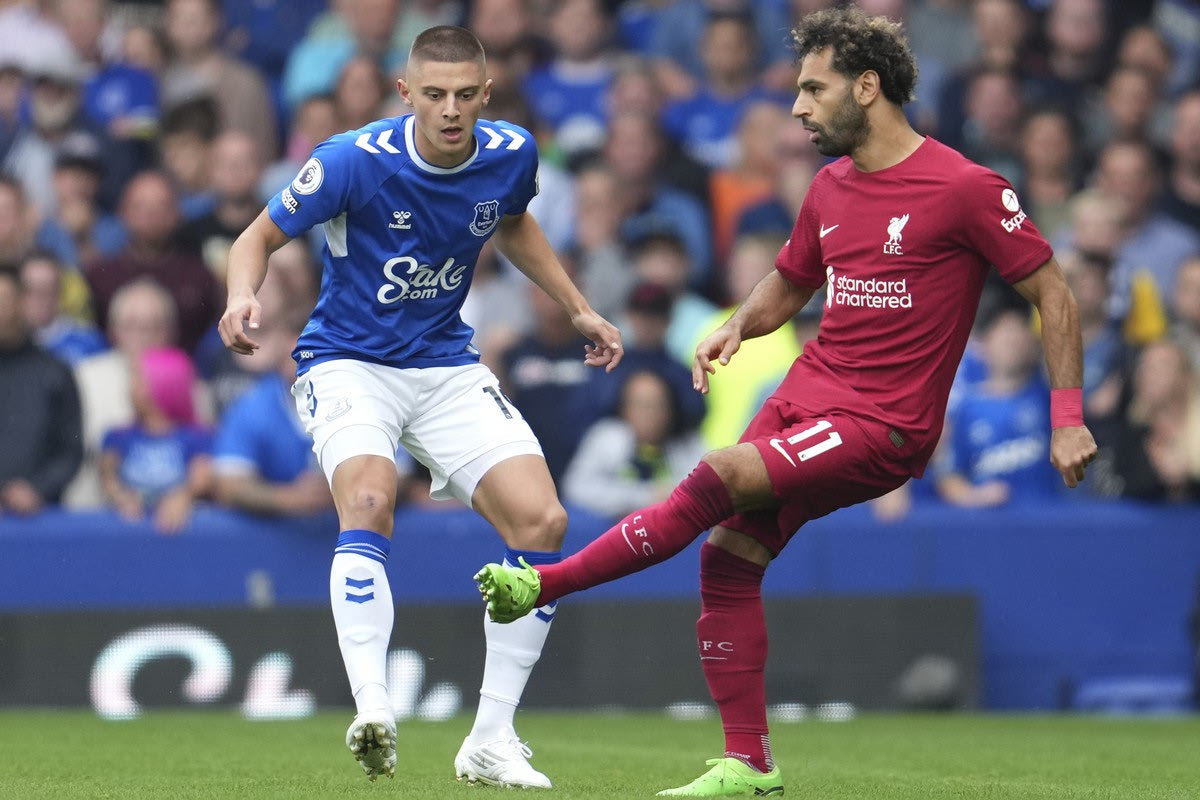 Everton's Vitaliy Mykolenko, left, and Liverpool's Mohamed Salah vie for the ball during the English Premier League soccer match between Everton and Liverpool at Goodison Park, Liverpool, England, Saturday, Sept. 3, 2022. (AP Photo/)