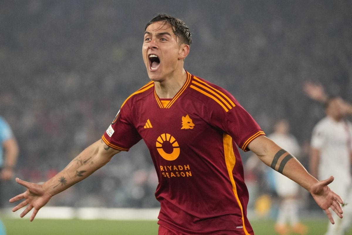 Ο Πάουλο Ντιμπάλα της Ρόμα πανηγυρίζει γκολ που σημείωσε κόντρα στη Μίλαν για τα προημιτελικά του Europa League 2023-2024 στο "Ολίμπικο", Ρώμη | Πέμπτη 18 Απριλίου 2024