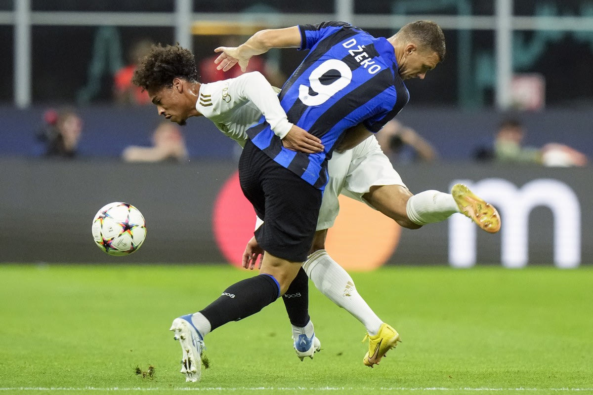Inter Milan's Edin Dzeko and Bayern's Leroy Sane, left, vie for the ball during the Champions League, group C soccer match between Inter Milan and Bayern Munich, at the Milan San Siro stadium, Italy, Wednesday, Sept. 7, 2022. (AP Photo/Luca Bruno)