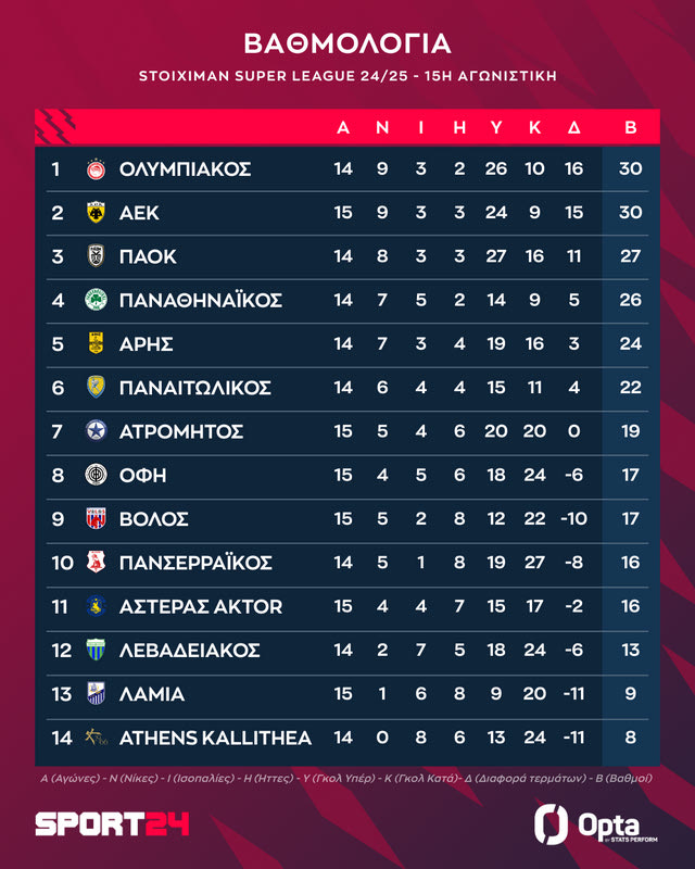 Μετά από την απόδραση της ΑΕΚ από την Λαμία (1-0), την εντός έδρας επιτυχία του Βόλου απέναντι στον Αστέρα AKTOR (2-1) και τη λευκή ισοπαλία στο Περιστέρι μεταξύ του Ατρομήτου και του ΟΦΗ, τη σκυτάλη παίρνουν την Κυριακή (15/12) άλλα τρία παιχνίδια για την 15η αγωνιστική της Stoiximan Super League.