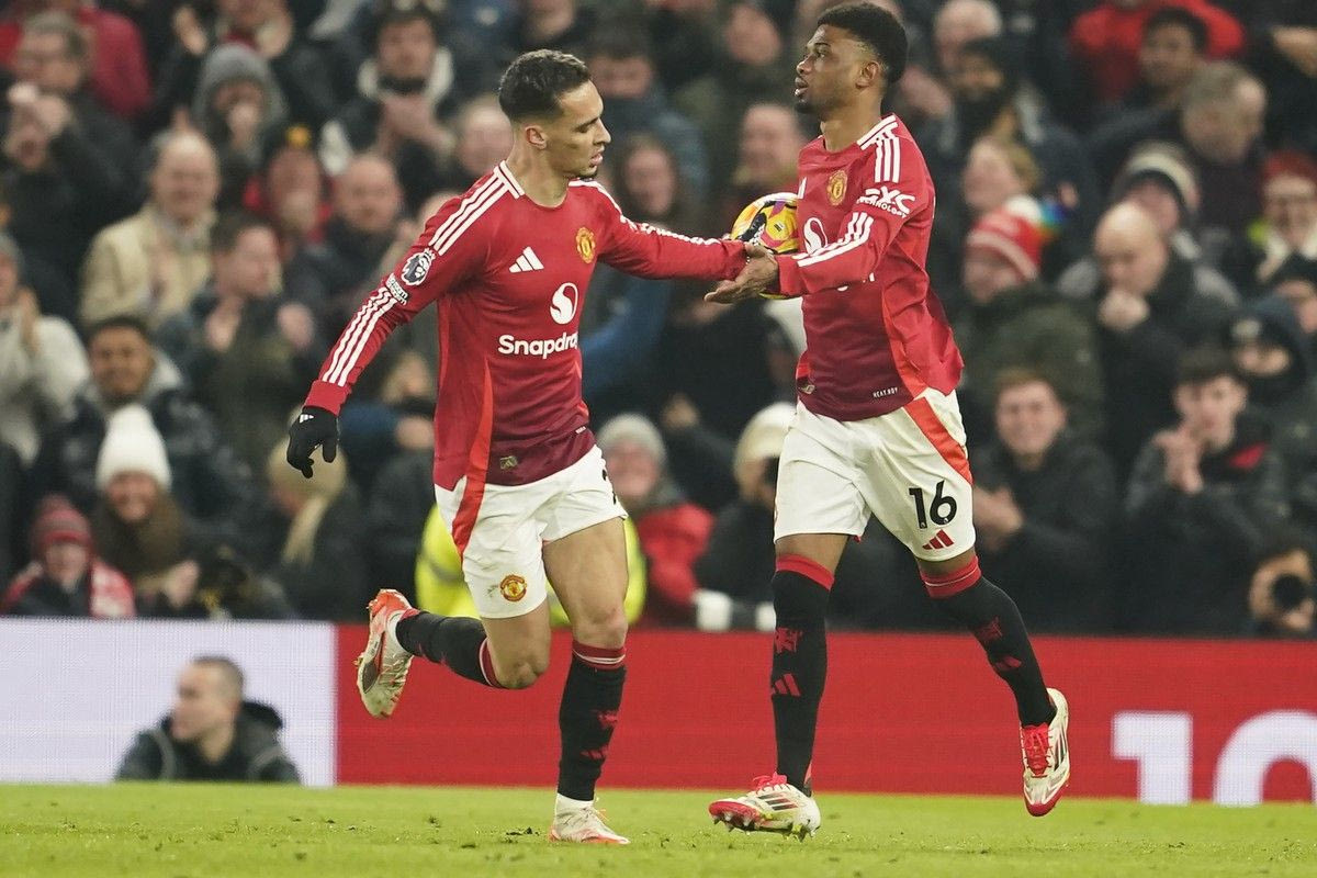 Manchester United's Amad Diallo, right, celebrates with Antony after scoring his side's first goal during the English Premier League soccer match between Manchester United and Southampton at the Old Trafford stadium in Manchester, England, Thursday, Jan. 16, 2025. (AP Photo/Dave Thompson)