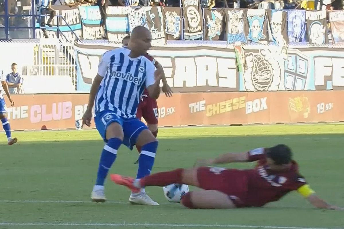 Ο Έλληνας επιθετικός πίστεψε πως μπορεί να επωφεληθεί από το κακό κοντρόλ του Μανσούρ λίγο έξω από την περιοχή των γηπεδούχων, όμως έφτασε καθυστερημένα και η προβολή του βρήκε μόνο στον αμυντικό του Ατρομήτου με τις τάπες.