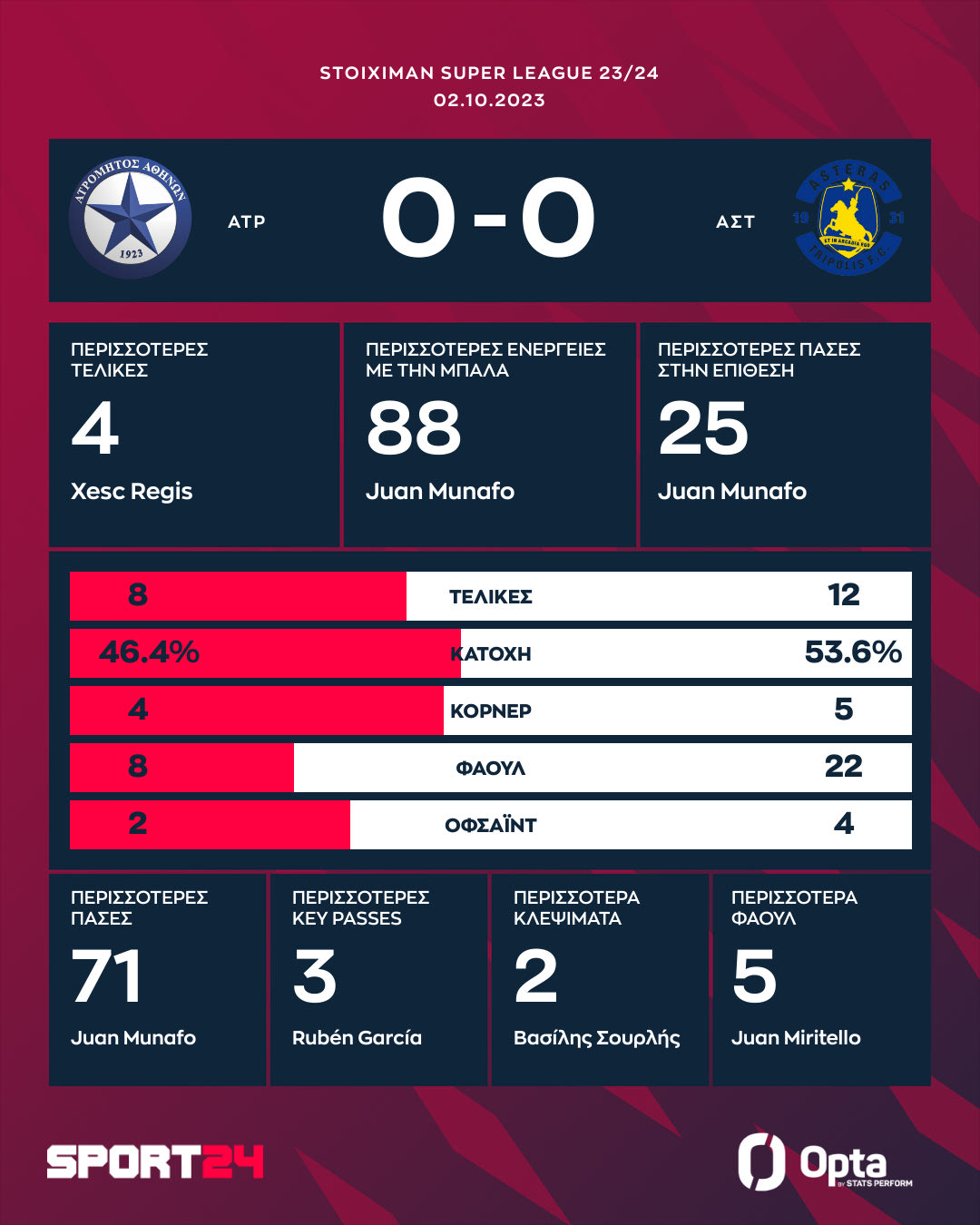Ισόπαλο 0-0 έληξε το παιχνίδι ανάμεσα στον Ατρόμητο και τον Αστέρα για την 7η αγωνιστική της Stoiximan Super League. Οι Περιστεριώτες αγωνίζονταν με δέκα παίκτες από το 56', με τους Αρκάδες να μην το αξιοποιούν.