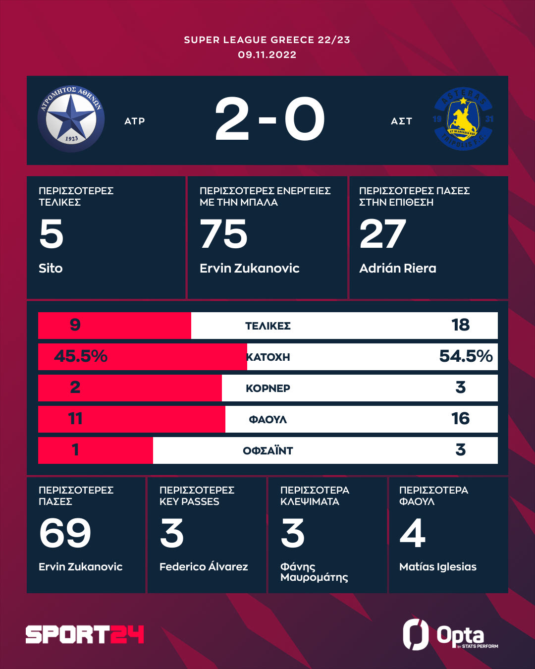 Αστέρας: Παπαδόπουλος, Γκαρντάβσκι (46′ Καρμόνα), Καστάνιο, Ζουκάνοβιτς, Τασουλής (67′ Άλβαρες), Ιγκλέσιας, Μουνάφο (67′ Μπερτόγλιο), Κρεσπί, Σίτο, Ριέρα, Μπαράλες (57′ Μπενίτο).
