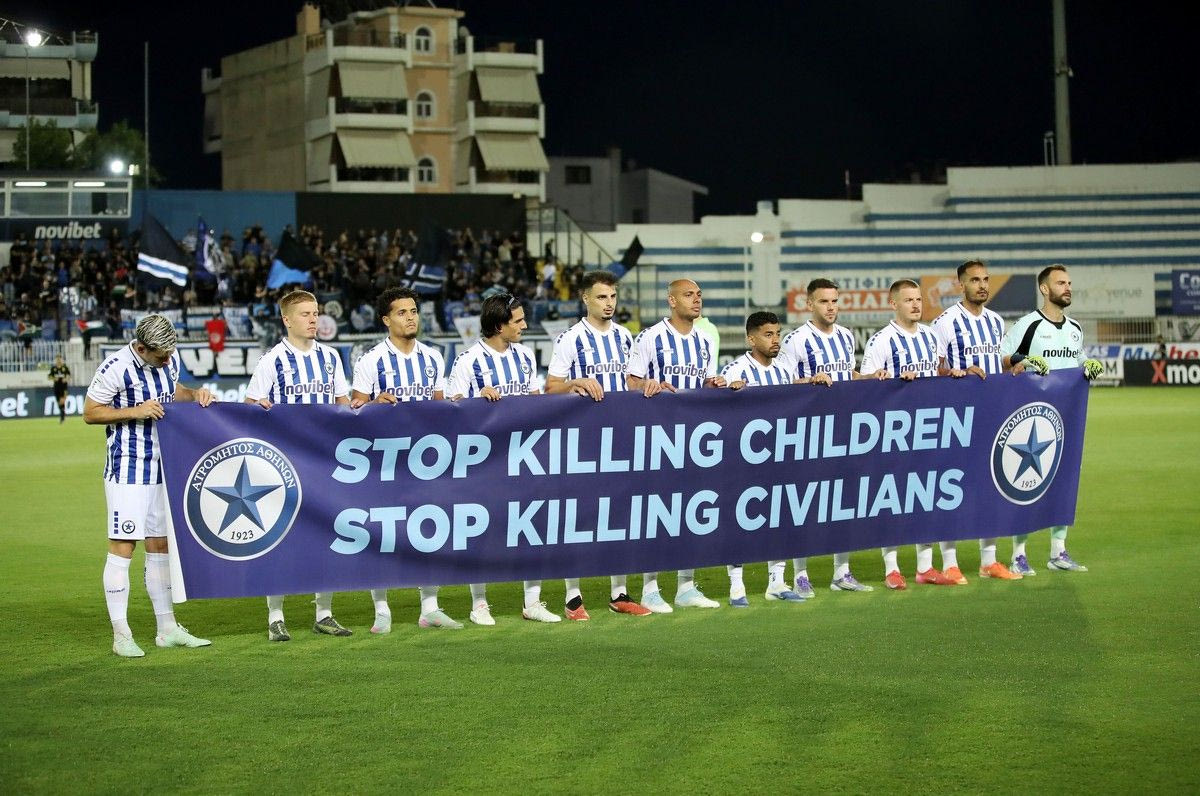Την αλληλεγγύη του στον λαό της Παλαιστίνης έδειξε ο Ατρόμητος στο πλαίσιο του αγώνα με τον Άρη. Οι παίκτες του Λεωνίδα Βόκολου βγήκαν στον αγωνιστικό χώρο και κράτησαν ένα πανό που έγραφε, “σταμάτηστε να σκοτώνετε παιδιά, σταματήστε να σκοτώνετε πολίτες”.
