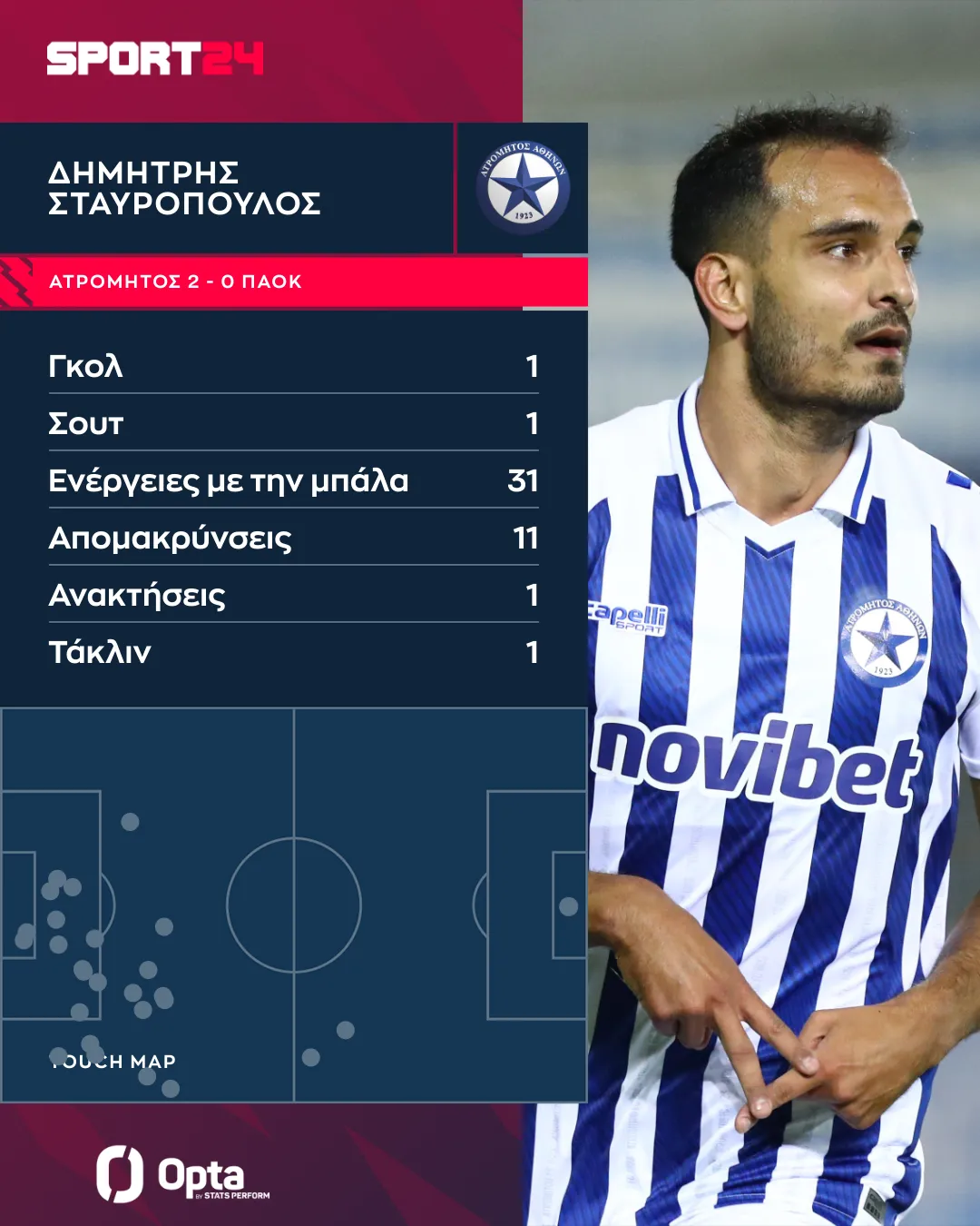 Στο γράφημα της Opta/Stats Perform μπορείτε να δείτε όλες τις ενέργειες και τις επιδόσεις του Δημήτρη Σταυρόπουλου στην αναμέτρηση απέναντι στον ΠΑΟΚ.