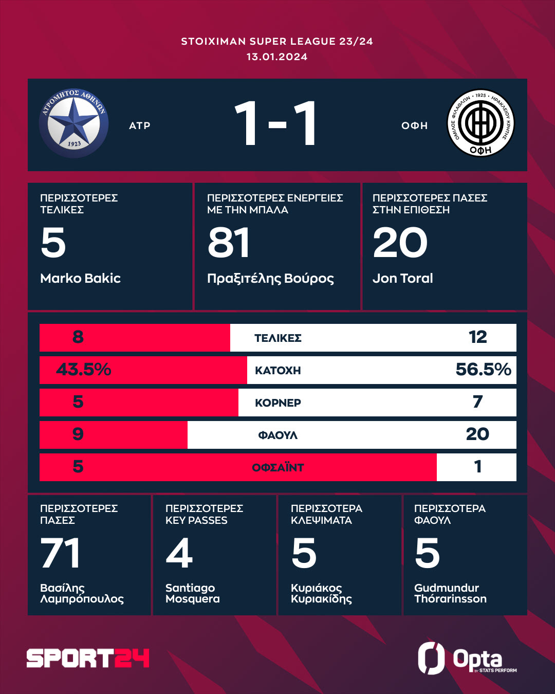 Λίγο έλειψε ο ΟΦΗ να φύγει με το διπλό από το Περιστέρι και να πανηγυρίσει την πρώτη του νίκη από τις 2 Οκτωβρίου, όμως ο Βαλένσια με κεφαλιά στο 90+8′ ισοφάρισε σε 1-1 για τον Ατρόμητο, συνεχίζοντας το αήττητο σερί της ομάδας του στο πλαίσιο της 18ης αγωνιστικής της Stoiximan Super League.