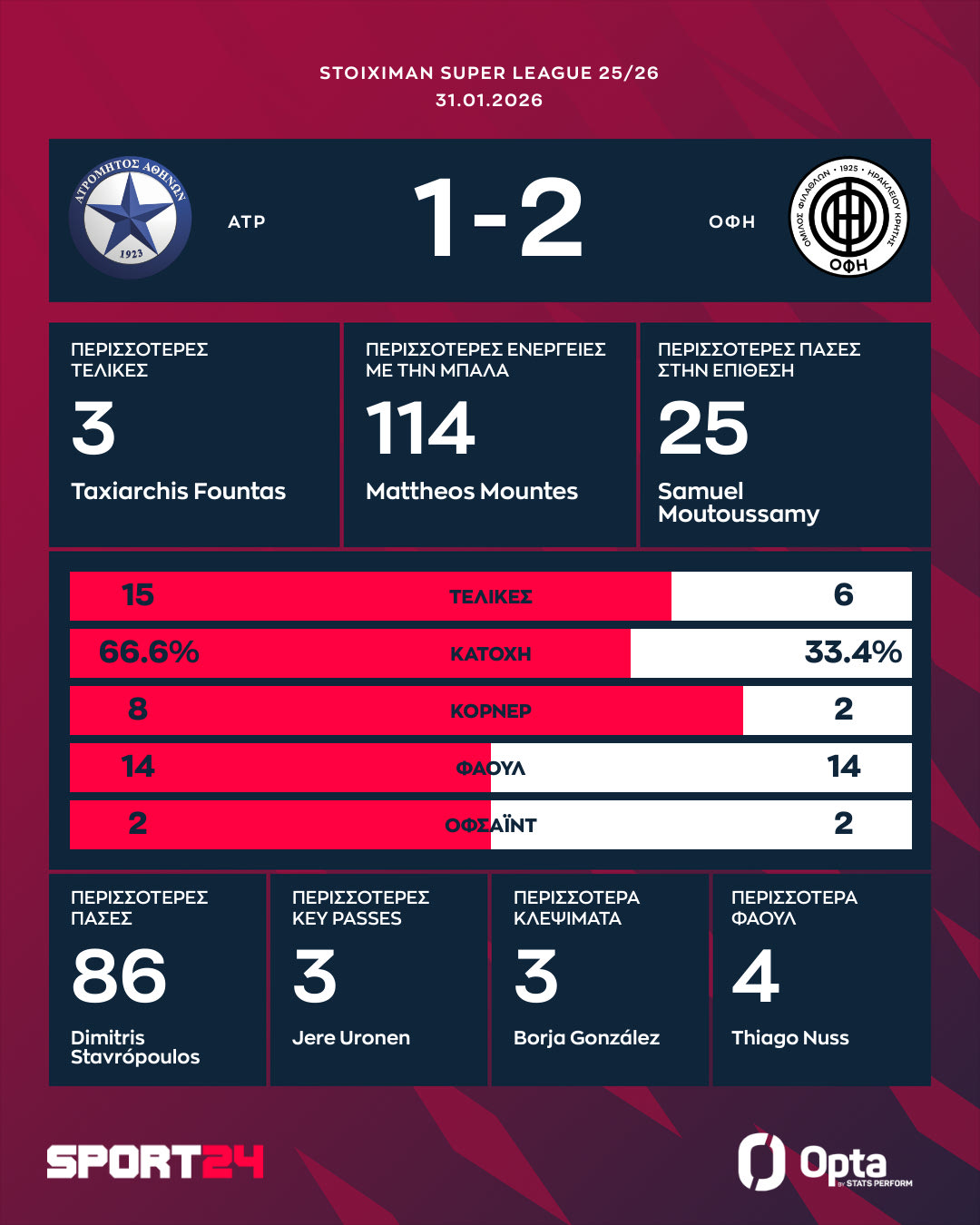Ο ΟΦΗ πήρε εκ νέου προβάδισμα στο 49′, με τον Φούντα να διπλασιάζει τα τέρματά του, παίρνοντας το ριμπάουντ στο δοκάρι του Αποστολάκη. Ο Ατρόμητος πίεσε για την ισοφάριση, αλλά οι παίκτες του Κόντη άντεξαν και έφυγαν με το διπλό.