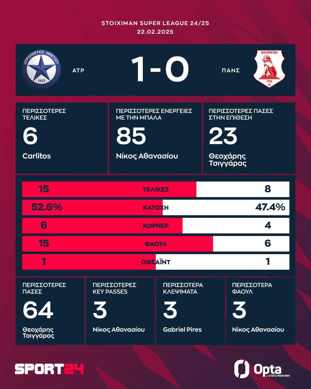 Ο αγώνας στο Περιστέρι το απόγευμα του Σαββάτου (22/2) βρήκε αντιμέτωπες δύο ομάδες με μεγάλο βαθμολογικό κίνητρο, με τον Ατρόμητο να κυνηγάει το τρίποντο για να μείνει ζωντανός στη μάχη της οκτάδας και τον Πανσερραϊκό να επιδιώκει το θετικό αποτέλεσμα για να παραμείνει στη μεγάλη κατηγορία.
