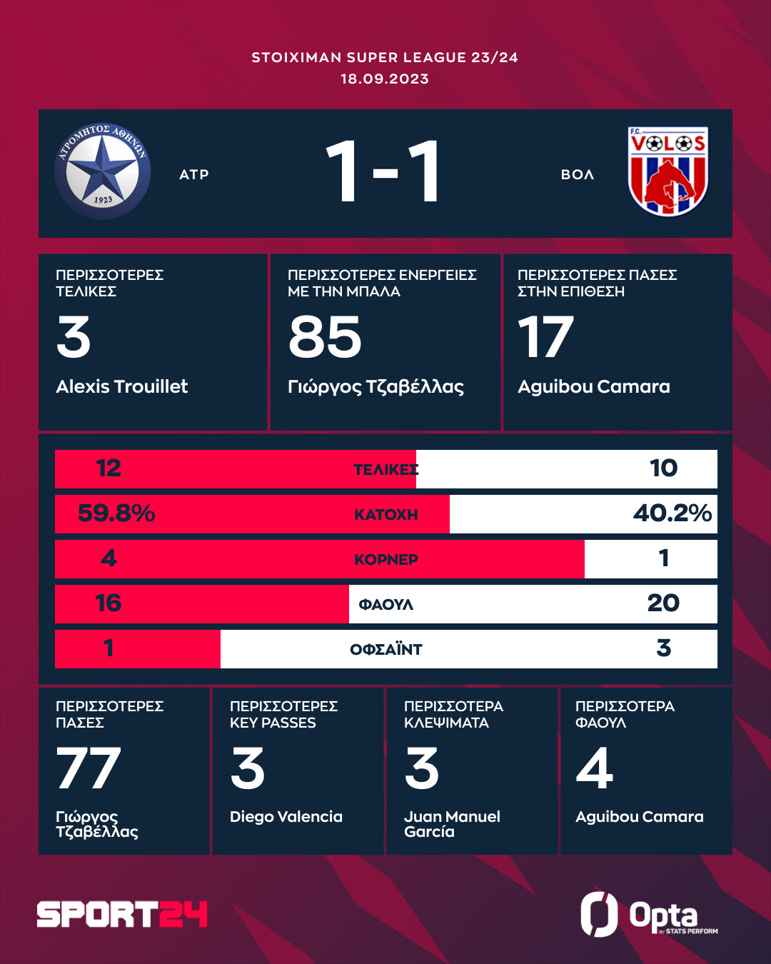 Ατρόμητος: Τσιντώτας, Κεσχρίντα, Αθανασίου, Ασεβέδο, Τζαβέλλας, Γκονζάλες (59′ Κούντε), Φριντζόνσον, Καμαρά, Ρομπάιγ (72′ Γιουμπιτάνα), Βαλένσια, Ανγκιέλσκι (59′ Βέργος).