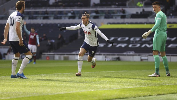 Ο Γκάρεθ Μπέιλ πανηγυρίζει γκολ του με τη φανέλα της Τότεναμ κόντρα στην Μπέρνλι για την Premier League ⓒ 2021 Julian Finney/Associated Press