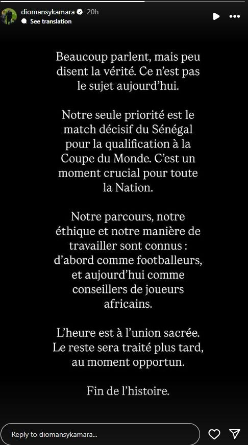 “Πολλοί μιλάνε, αλλά λίγοι λένε την αλήθεια. Η μόνη μας προτεραιότητα είναι ο αποφασιστικός αγώνας της Σενεγάλης για την πρόκριση στο Παγκόσμιο Κύπελλο. Αυτή είναι μια κρίσιμη στιγμή για ολόκληρο το έθνος.Τα υπόλοιπα θα τακτοποιηθούν αργότερα, την κατάλληλη στιγμή”, ρίχνοντας μια ξεκάθαρη βολή προς το πρόσωπο του Χένες.