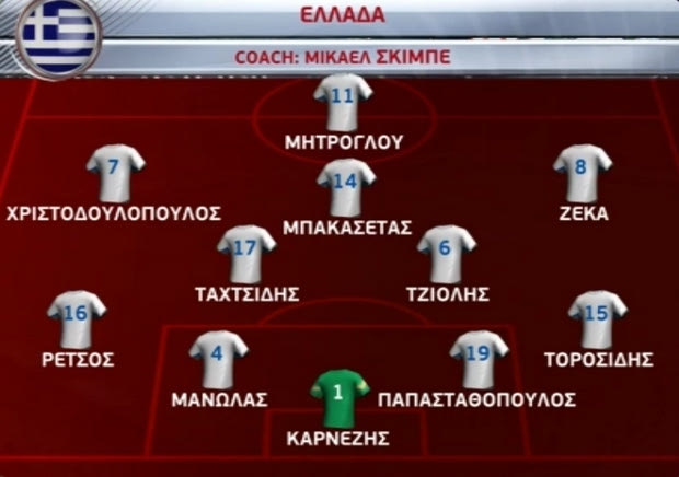 Έξι αλλαγές έκανε ο Μίκαελ Σκίμπε σε σχέση με τον πρώτο αγώνα στην Κροατία. Μανωλάς και Τοροσίδης επέστρεψαν στην άμυνα, ενώ ο Ρέτσος ξεκίνησε ως αριστερό μπακ. Μόνο ο Παπασταθόπουλος διατήρησε τη θέση του απ’τους πέντε που ξεκίνησαν στο 5-3-2 του Ζάγκρεμπ. Μπακασέτας-Χριστοδουλόπουλος ήταν τα νέα πρόσωπα μπροστά απ’την άμυνα, που ξεκίνησαν στα άκρα στο 4-3-3 του Σκίμπε.