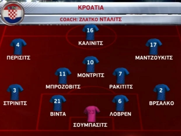 Οι Κροάτες δεν είχαν σπουδαίο λόγο να προβούν σε πολλές αλλαγές. Οι ενοχλήσεις είχαν αφήσει τον Μάντζουκιτς έξω απ’τον πρώτο αγώνα, αλλά στο Φάληρο ο επιθετικός της Γιουβέντους ξεκίνησε στη θέση του Κράμαριτς. Οι υπόλοιποι δέκα διατήρησαν τη θέση τους, δείγμα κι αυτό της σοβαρότητας με την οποία οι Κροάτες αντιμετώπισαν τη ρεβάνς, παρά το 4-1 του πρώτου αγώνα.