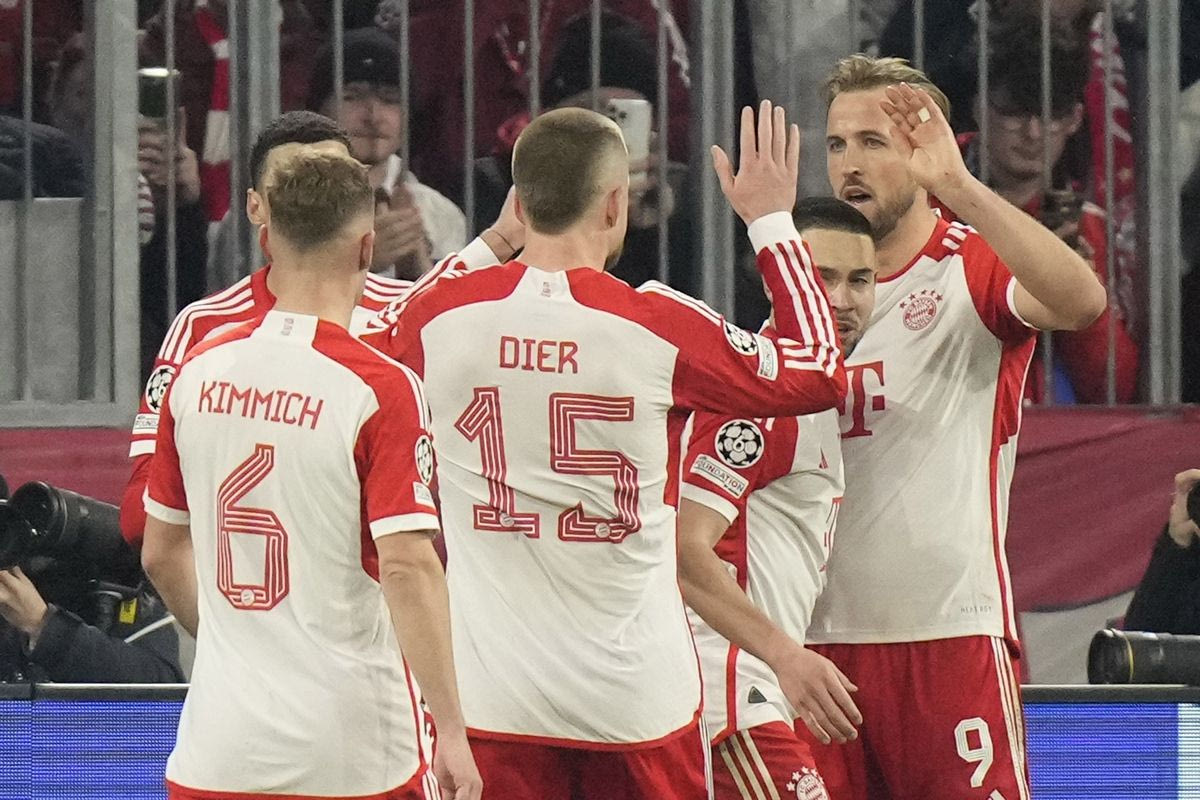 Bayern's Harry Kane, right, celebrates with his teammates after scoring his side's opening goal during the Champions League round of 16 second leg soccer match between FC Bayern Munich and Lazio at the Allianz Arena stadium in Munich, Germany, Tuesday, March 5, 2024. (AP Photo/Matthias Schrader)