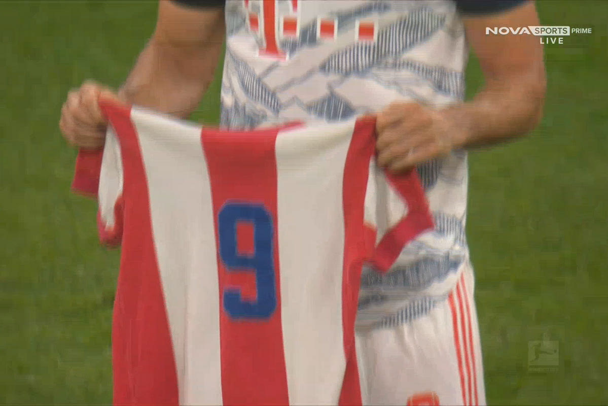 Τότε που ο Πολωνός φορ κρατούσε μία φανέλα του Γκερντ Μίλερ από την εποχη που αγωνιζόταν εκείνος και την ύψωσε στον ουρανό ενώ ο Γερμανός συμπαίκτης του έκανε το ίδιο, κρατώντας μία τωρινή φανέλα της Μπάγερν με το όνομα του Μίλερ και το Νο 9 στην πλάτη.