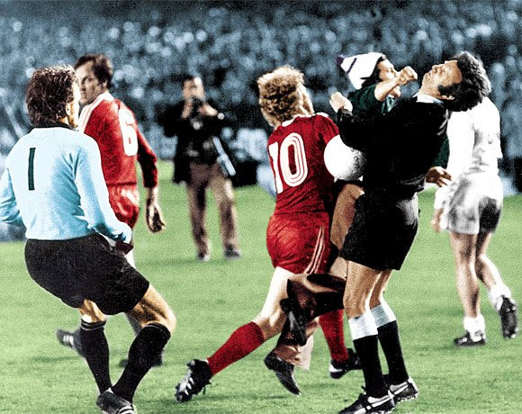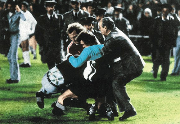 Ο “τρελός του Μπερναμπέου” μόλις έχει χτυπήσει τον διαιτητή παρά την προσπάθεια του Χένες (10) να τον σταματήσει, ενώ ο Μάγιερ (1) είναι έτοιμος να επέμβει!