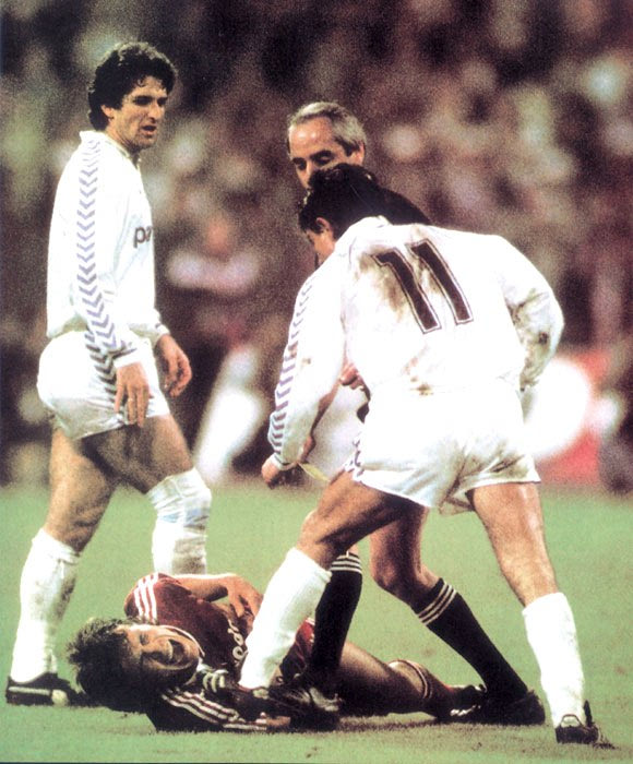 Έντεκα χρόνια αργότερα οι δρόμοι Μπάγερν και Ρεάλ συναντήθηκαν και πάλι σε ακόμα έναν ημιτελικό του Κυπέλλου Πρωταθλητριών και αυτή τη φορά τα πράγματα εξελίχθηκαν ακόμα χειρότερα για τους “μερένγκες”. Η ανωτερότητα των Βαυαρών απέναντι στην Quinta del Buitre φάνηκε ξεκάθαρα από το πρώτο ματς (4-1), όμως το ματς σημαδεύτηκε από ένα δολοφονικό χτύπημα, ένα από τα χειρότερα που έχουμε δει ποτέ σε παιχνίδια τέτοιου επιπέδου. Η Μπάγερν είχε προηγηθεί 3-0 από το 37′ του πρώτου ημιχρόνου, με αποτέλεσμα τον ανεξέλεγκτο εκνευρισμό των Ισπανών. Τρία λεπτά μετά το 3-0, ο Τσέντο έκανε μια επέλαση, όταν ο Ματέους, σαν δρεπανηφόρο, τον σήκωσε από το έδαφος με ένα βίαιο και αντιαθλητικό μαρκάρισμα. Ο Τσέντο έτρεξε αμέσως προς το μέρος του Γερμανού και τον έσπρωξε ρίχνοντάς τον στο χορτάρι. Όμως από την άλλη μεριά είχε ήδη πάρει φόρα ο “illa illa Χουανίτο maravilla”, πατώντας δολοφονικά τον Ματέους πρώτα στη μέση και μετά στο κεφάλι! Ο Σκωτσέζος διαιτητής Μπομπ Βάλενταϊν του έδειξε αμέσως την κόκκινη κάρτα, ενώ ο Ματέους δέχτηκε τις πρώτες βοήθειες στο κεφάλι του που αιμορραγούσε από το απίστευτο πάτημα του Ισπανού.