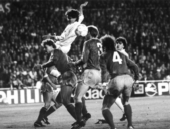 Φάση μπροστά στη γερμανική εστία στον επαναληπτικό του “Μπερναμπέου”. Στον αέρα ο Τεντίγιο, δεξιά ο Σαντσίς, με το 3 ο Πφλίγκλερ, με το 4 ο Έντερ και με το 7 ο Βόλφαρτ (16/3/1988)