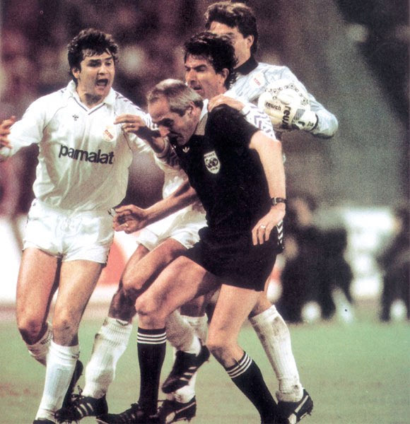Ο Χουανίτο πατάει τον Ματέους μπροστά στον Σκωτσέζο διαιτητή Μπομπ Βάλενταϊν, ενώ ο Τσέντο παρακολουθεί (8/4/1987)