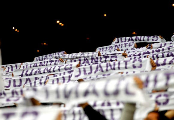 Το πέταλο του “Μπερναμπέου” γεμάτο με κασκόλ με το όνομα του Χουανίτο, για να πικάρει τους Βαυαρούς (25/4/2012)