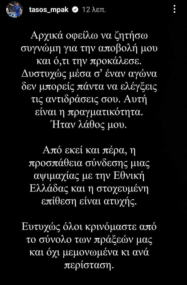 Συγκεκριμένα, μέσω Insta Story ζήτησε συγνώμη για την αποβολή του, ενώ εν συνεχεία στάθηκε στην “προσπάθεια σύνδεσης μιας αψιμαχίας με την Εθνική Ελλάδας” και την “στοχευμένη επίθεση” πράξεις που χαρακτήρισε ως “ατυχείς”.