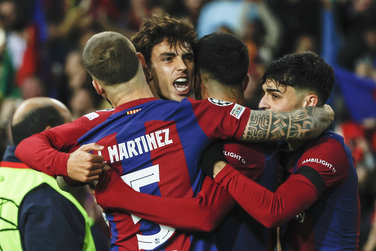 Οι παίκτες της Μπαρτσελόνα πανηγυρίζουν γκολ που σημείωσαν κόντρα στην Πόρτο για τη φάση των ομίλων του Champions League 2023-2024 στο Ολυμπιακό Στάδιο Βαρκελώνης | Τρίτη 28 Νοεμβρίου 2023 © 2023/Joan Monfort/AP IMAGES
