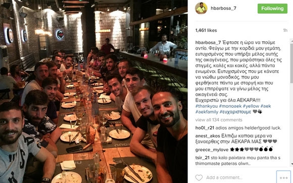 Ο Έλντερ Μπαρμπόζα αποχαιρέτησε μέσω Instagram την ΑΕΚ, δημοσιεύοντας φωτογραφία από το τραπέζι που έκανε στους συμπαίκτες του και απευθύνοντας ένα μήνυμα στους φίλους της Ένωσης.