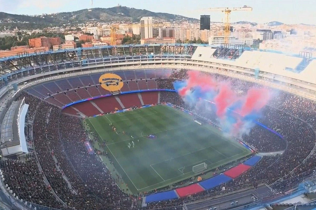 Η ατμόσφαιρα ήταν γιορτινή, με τα χρώματα της Μπαρτσελόνα να “βάφουν” τον ουρανό του Καμπ Νόου και μία χορωδία να τραγουδάει τον ύμνο, κατά την είσοδο των δύο ομάδων στον αγωνιστικό χώρο.