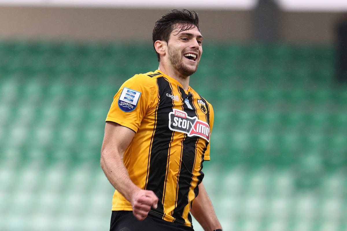 Ο Λούκας Μπογέ πανηγυρίζει γκολ που σημείωσε με τη φανέλα της ΑΕΚ