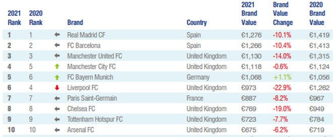 Η έκθεση της εταιρίας καταλήγει σε εκτίμηση πτώσης 11% του brand value της Μπαρτσελόνα ή αλλιώς κατά 137.000.000 σε σχέση με την αξιολόγηση του 2021, με αποτέλεσμα ο σύλλογος να υποχωρήσει στην 3η θέση του top-50, πίσω από τη Μάντσεστερ Γιουνάιτεντ.