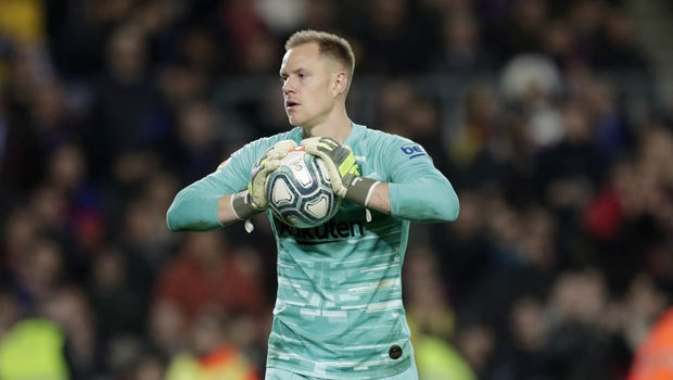Barcelona's goalkeeper Marc-Andre ter Stegen holds the ball during a Spanish La Liga soccer match between Barcelona and Real Madrid at Camp Nou stadium in Barcelona, Spain, Wednesday, Dec. 18, 2019. (AP Photo/Bernat Armangue) AP Photo/Bernat Armangue