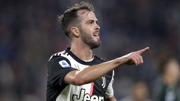 Juventus' Miralem Pjanic celebrates after scoring his side's second goal during a Serie A soccer match between Juventus and Bologna, at the Allianz stadium in Turin, Italy, Saturday, Oct.19, 2019. (AP Photo/Luca Bruno)