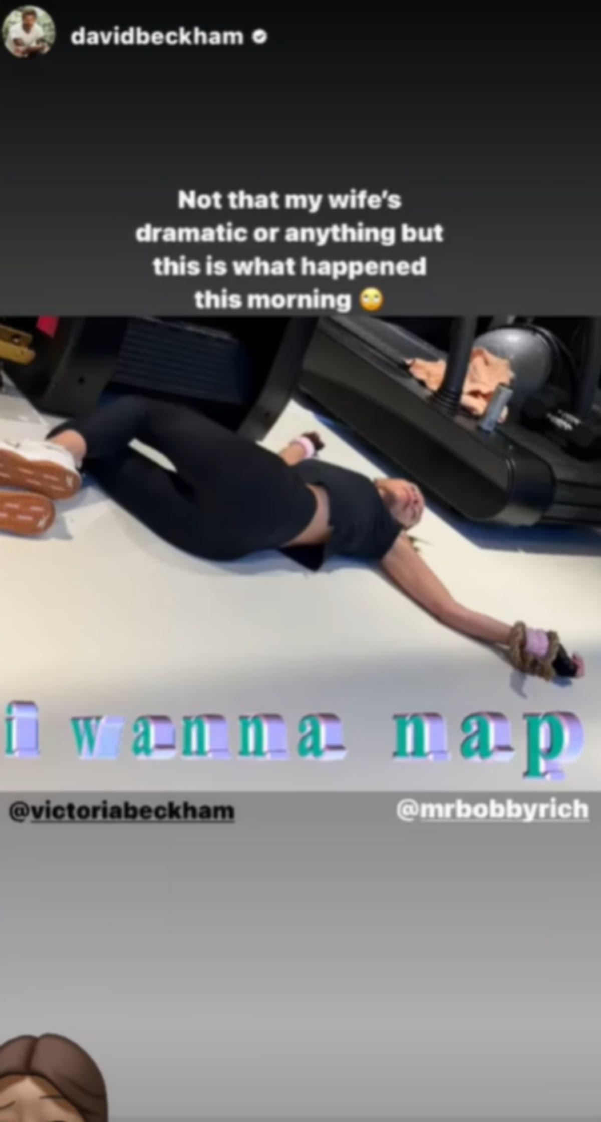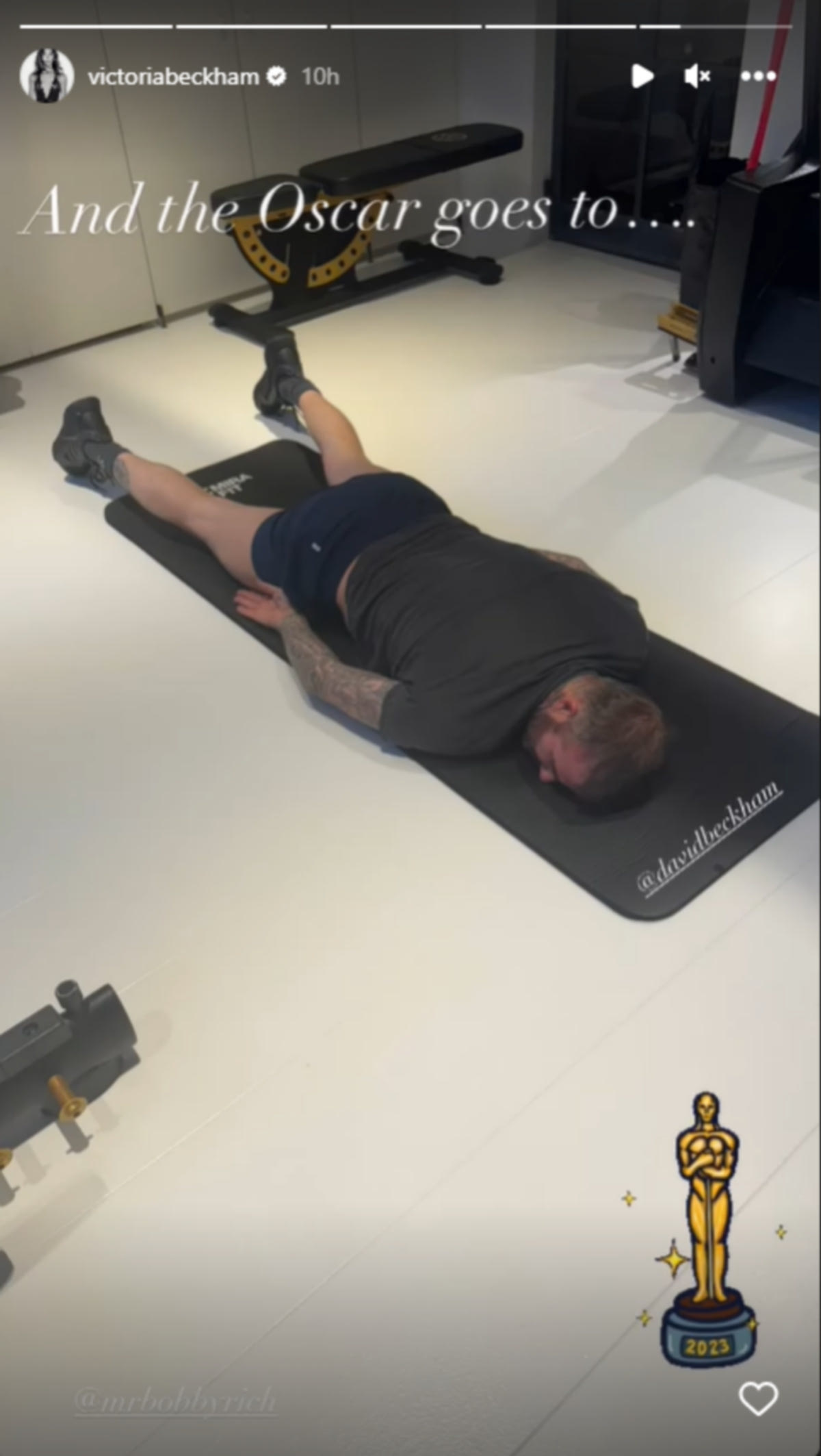 Εκείνη με τη σειρά της ανταπέδωσε, αναρτώντας μία φωτογραφία του Μπέκαμ, ο οποίος εμφανώς εξοντωμένος, έχει γίνει ένα με το πάτωμα.
