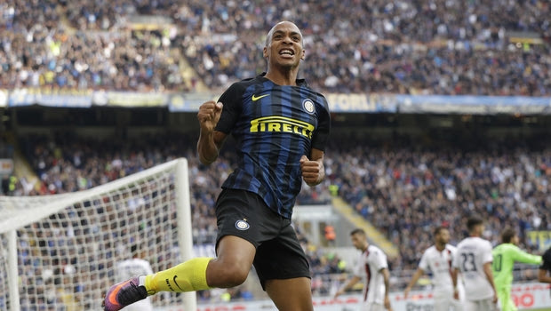 Inter Milan's Joao Mario celebrates after scoring during a Serie A soccer match between Inter Milan and Cagliari, at the San Siro stadium in Milan, Italy, Sunday, Oct. 16, 2016. (AP Photo/Luca Bruno)