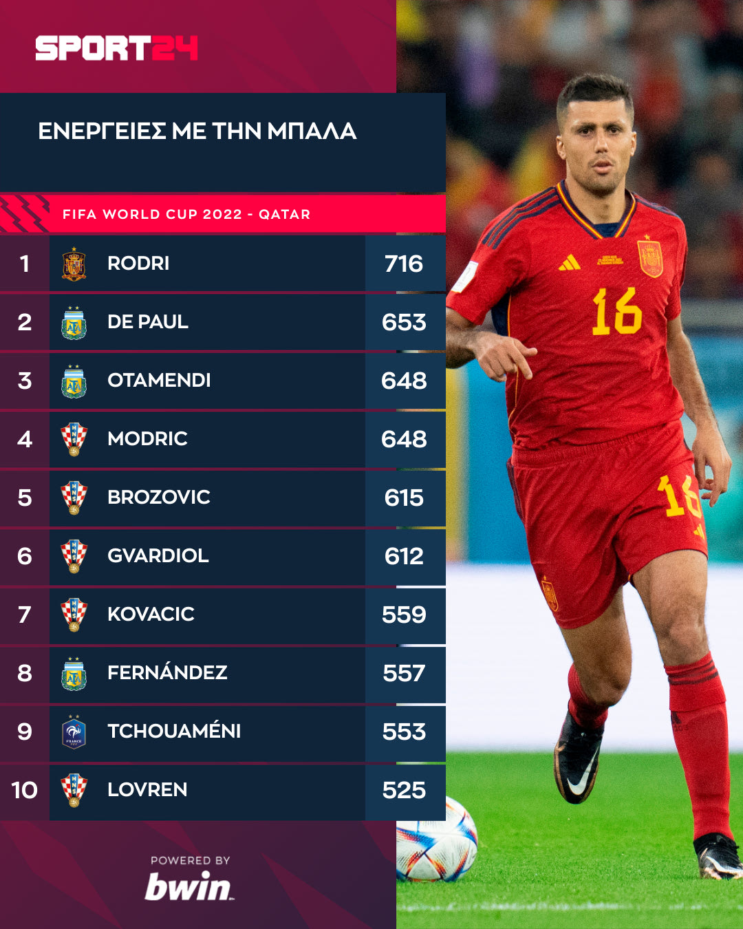 Το ίδιο ισχύει και για τους τοπ Κροάτες, τον Μόντριτς, τον Μπρόζοβιτς και τον Γκβάρντιολ. Το στιλ παιχνιδιού της Ισπανίας σε συνδυασμό με τα χαρακτηριστικά του Ρόδρι έκαναν όλο το παιχνίδι να περνάει από τα πόδια του και τον ίδιο να γράψει ασύλληπτη επίδοση.