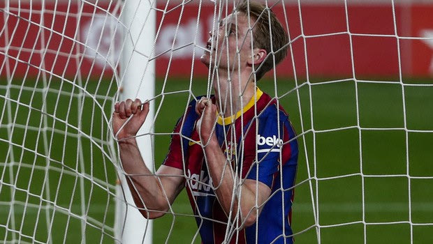 Barcelona's Frenkie de Jong reacts during the Spanish La Liga soccer match between FC Barcelona and Elche at the Camp Nou stadium in Barcelona, Spain, Wednesday, Feb. 24, 2021. (AP Photo/Joan Monfort)