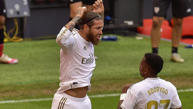 Real Madrid's Sergio Ramos, left, celebrates after scoring the opening goal from a penalty shoot during the Spanish La Liga soccer match between Athletic Club and Real Madrid at the San Manes stadium in Bilbao, Spain, Sunday, July 5, 2020. (AP Photo/Alvaro Barrientos)