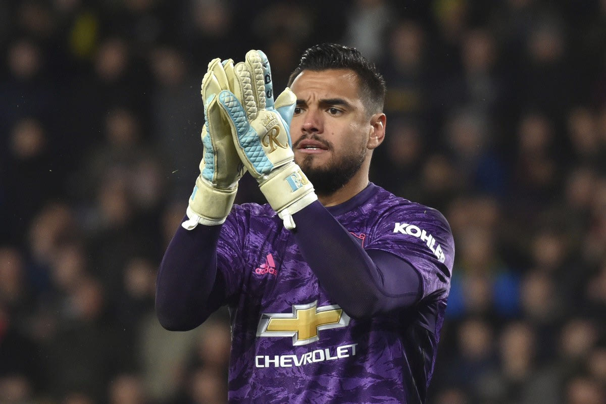 Manchester United's goalkeeper Sergio Romero during the FA Cup fifth round soccer match between Derby County and Manchester United at Pride Park in Derby, England, Thursday, March 5, 2020. (AP Photo/Rui Vieira)