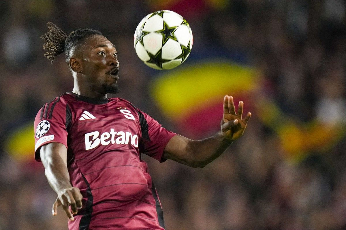 Sparta's Victor Olatunji controls the ball during the Champions League play-off second leg soccer match between Sparta Praha and Malmo at the Letna stadium in Prague, Czech Republic, Tuesday, Aug. 27, 2024. (AP Photo/Petr David Josek)