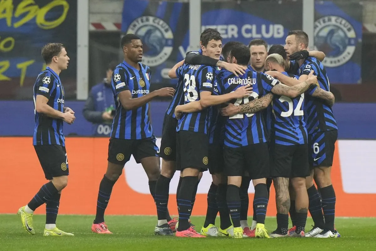 Inter Milan's players celebrate after scoring the opening goal during a Champions League opening phase soccer match between Inter Milan and Leipzig, at the San Siro stadium in Milan, Italy, Tuesday, Nov. 26, 2024. (AP Photo/Luca Bruno)